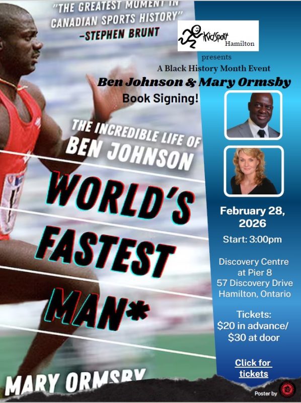 Join us as we welcome Ben Johnson back to Hamilton on February 15 at the Discovery Centre, where he’ll be joined by Author Mary Ormsby and will be signing copies of his biography: The Incredible Life of Ben Johnson, The World’s Fastest Man*