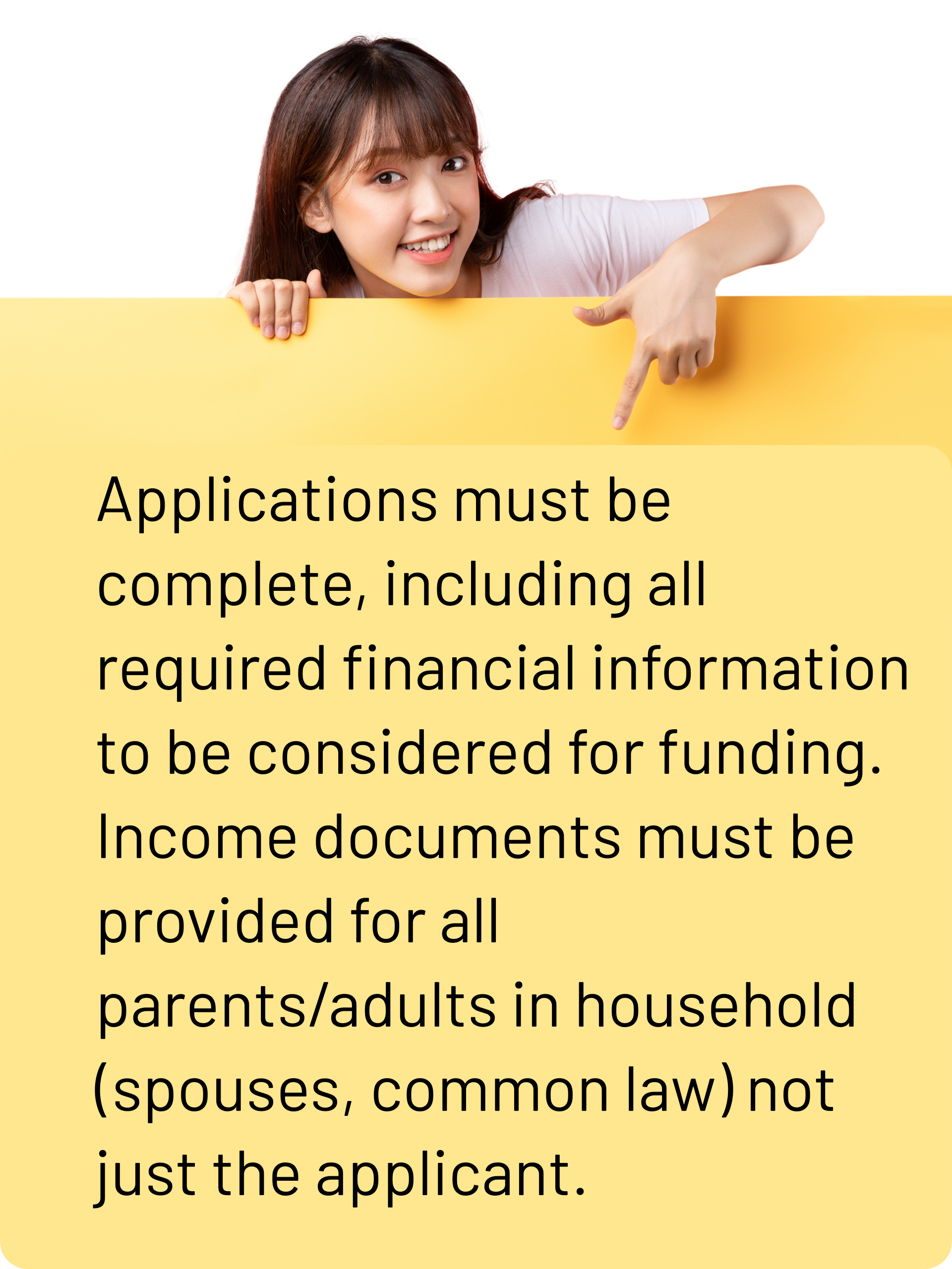 Applications must be complete, including all required financial information to be considered for funding. Income documents must be provided for all parents/adults (spouses, common-law partners) not just the applicant.